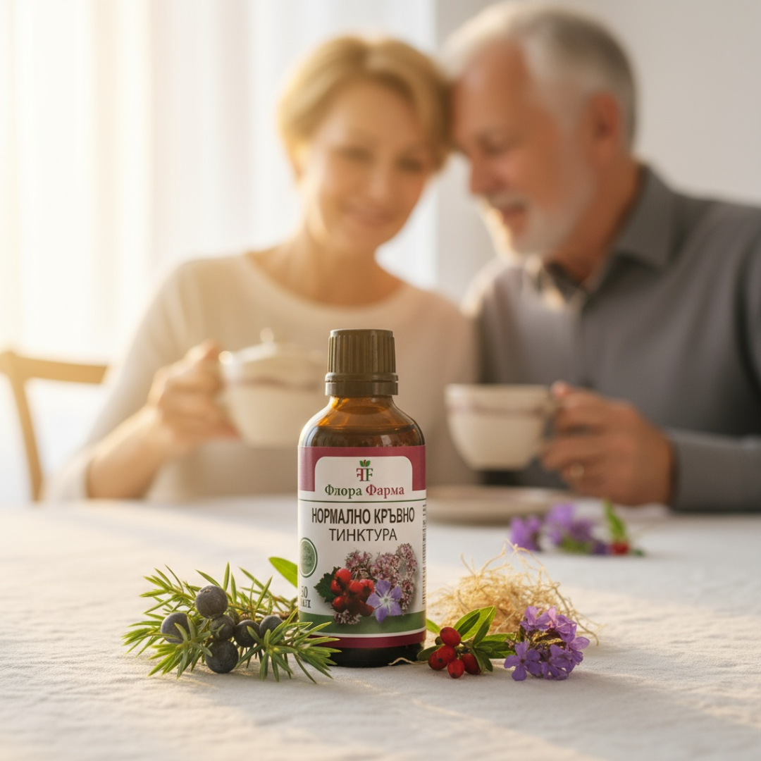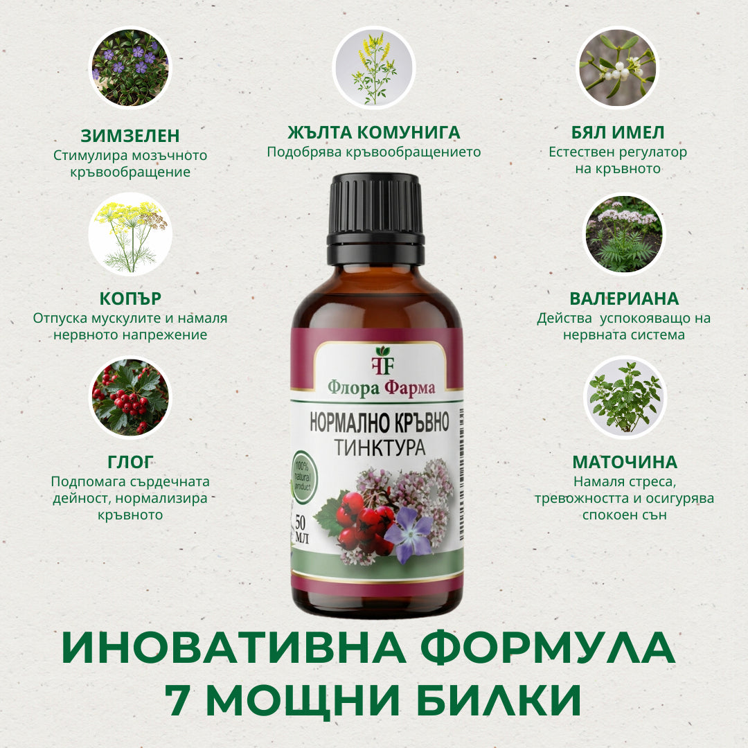 Тинктурата "Нормално кръвно" е иновативна формула, съчетаваща 7 традиционни билки, които подкрепят сърдечно-съдовата система, подобряват кръвообращението и успокояват нервната система, без да водят до нежелани ефекти.